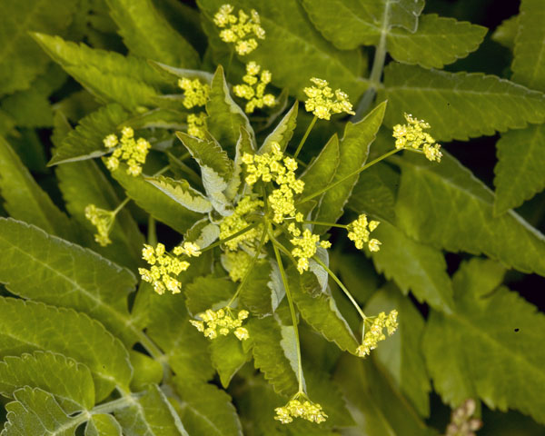 Found as a single specimen in meadow #1, these appear to be Golden Alexanders. (Zizia aptera) |