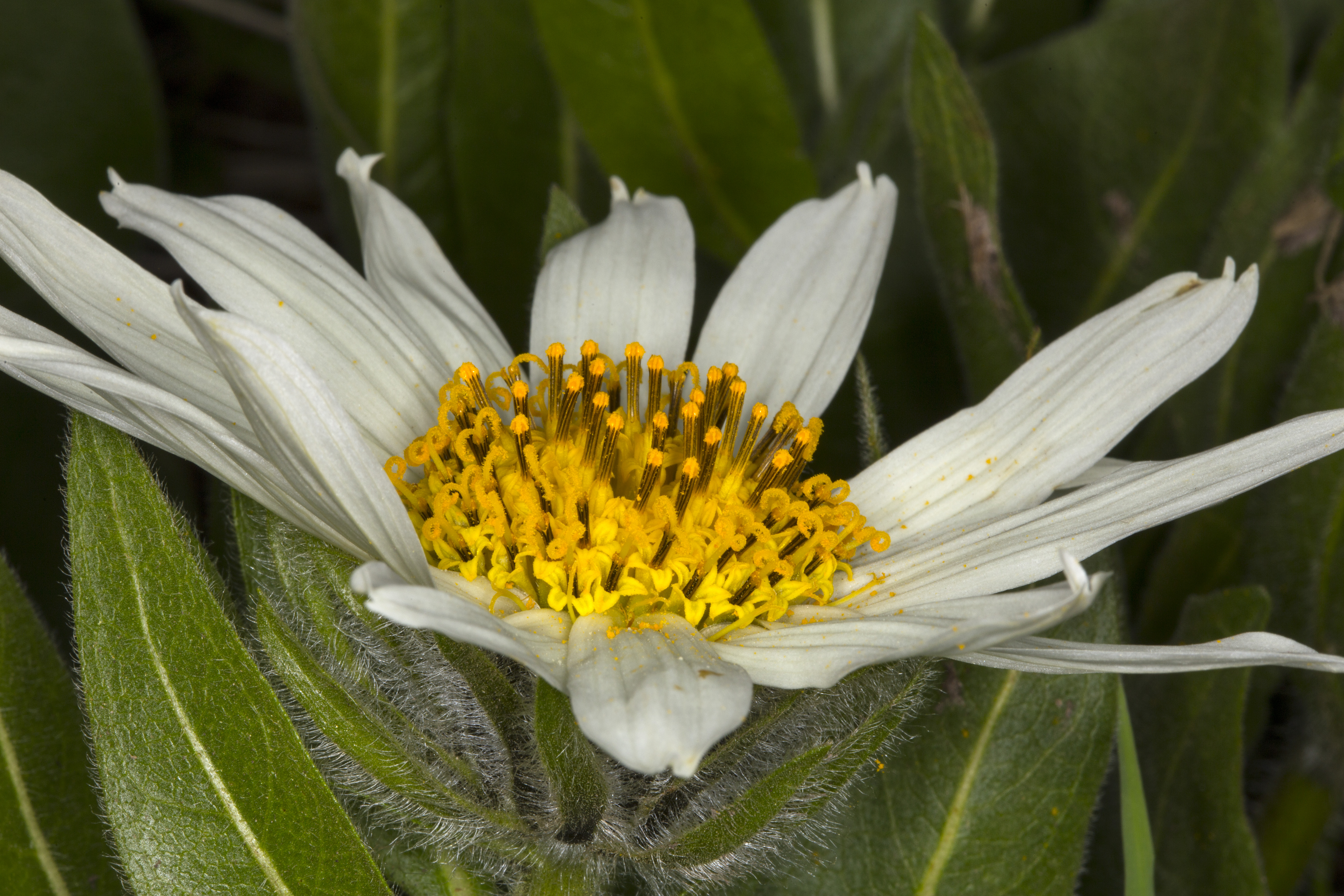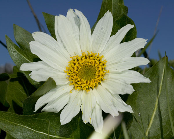 A lull in the wildflower blooming has been broken with the appearance of the White Mule Ears. Soon the meadow across from the RV Park will be covered with them. This is one of the first here. (Wyethia helianthoides) MORE.. |