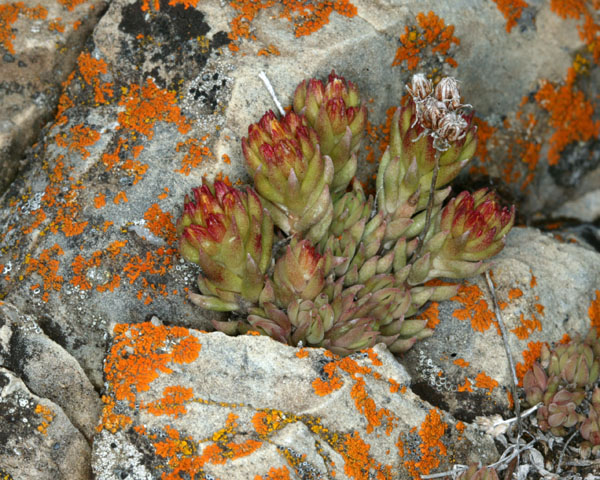 Some variety of Stonecrop with succulent leaves nestled in a crevase of a rock near the Idaho/Montana border, about 6 miles from the RV Park. Makes a beautiful display with the lichen. |